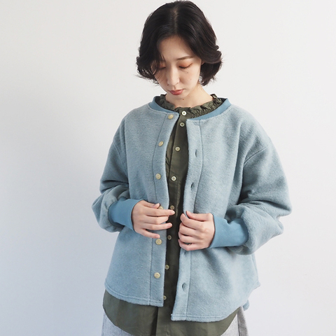 襟元は袖とお揃いのリブになっています。肩はドロップショルダーで女性らしく。