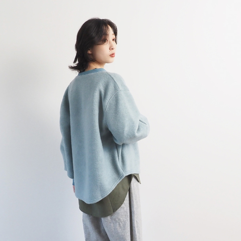 後ろが長くなっているので、スカートともパンツとも相性よく着れます。程よい厚みがありアウターとしても羽織れる1枚です。
