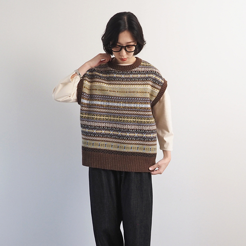 コーディネートがぱっと華やかになるフェアアイル柄ベストのご紹介です。ゆったりとした身幅で、どんなトップスとも相性の良いシルエット。
