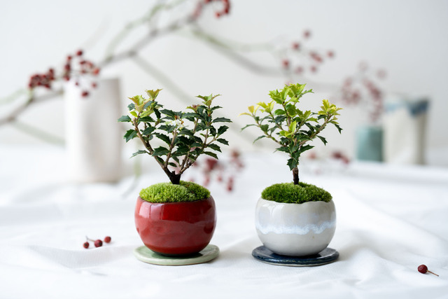 「クリスマスギフト」にもおすすめ、花も楽しめるヒイラギのミニ盆栽