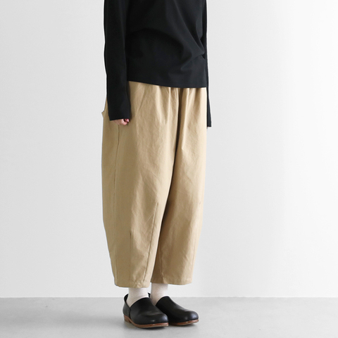 もも周りにたっぷりと生地を使用したバルーンシルエットで、裾に向けてテーパードがかかったきれいなラインのパンツです。