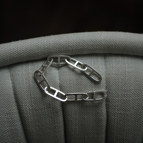 こちらは、角にエッジを効かせたアンカーデザインのブレスレット。純度の高いシルバー925ならではの輝きは、決して華美すぎることなく、スタイリングを優雅に彩ります。