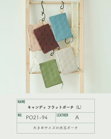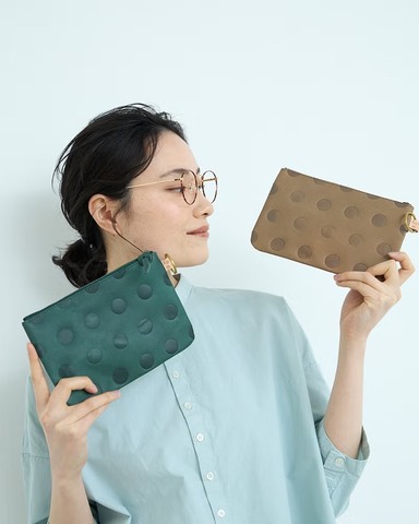 大人可愛い水玉模様と、しっとり手になじむ上質な牛革。シンプルで使いやすく、毎日持ちたくなるポーチです。全13色の中から、自分らしさに合うひとつを選ぶ楽しみも。バッグの中にそっと彩りと、ときめきを添えてくれます。