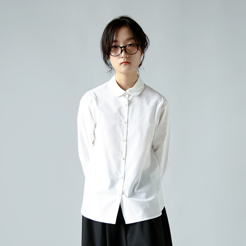 凛としたかわいらしさを持つ丸衿を採用する一方で、その他のパーツではできるだけオーソドックスなデザインを持つフォーマルシーンにピッタリのシャツに仕上げました。