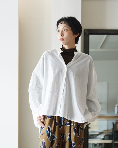 やわらかく風をはらむコットンローン素材を使用し、背中にたっぷりとギャザーを施した立体感のあるワイドシャツ。