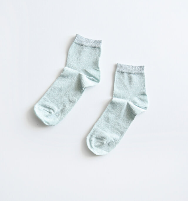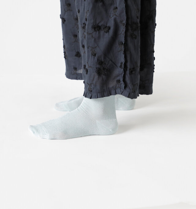足にグリッターが付いたショート丈のアンクルソックス。パンプスからスニーカーまで様々なシューズと合わせやすく、オケージョンシーンやデイリーコーデのスパイスとしてぴったりなカラーの展開です。
