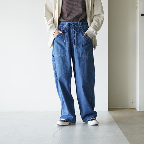 ウエストはゴム仕様だから、忙しい朝でもさっと穿けて毎日のコーディネートもストレスフリー。ゆったりとしたシルエットは体型を気にせず、おしゃれを楽しむことができ、柔らかく肌触りがよいデニム素材が快適な着心地を叶えます。