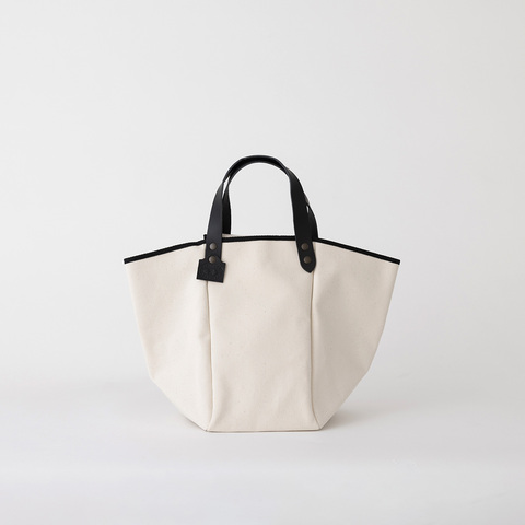 コットンキャンバスのカジュアルな素材感に、ブラックのレザーハンドルとパイピングを組み合わせることで、全体をきりっと引き締めたデザインに。