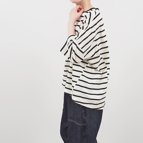 襟が細めのクルーネックで、首周りをすっきりと見せてくれます。