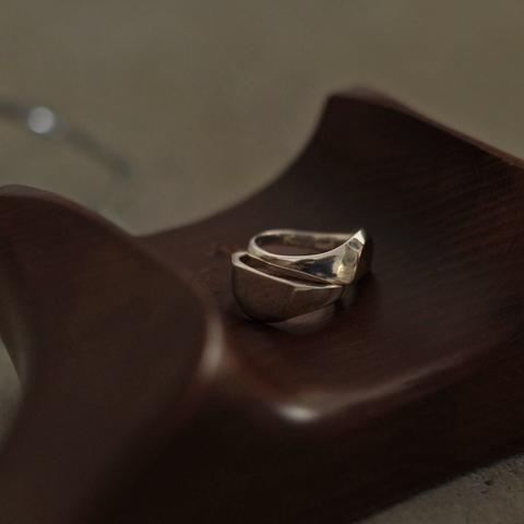 "古きを温ねて新しきを知る"をコンセプトに、ハンドメイドで制作されたアクセサリー。どこか懐かしく、それでいて現代的な、他にはない輝きを放つ逸品です。こちらは、クラシックなシグネットリングを水平に分割したような、ユニークなデザインのアイテムです。