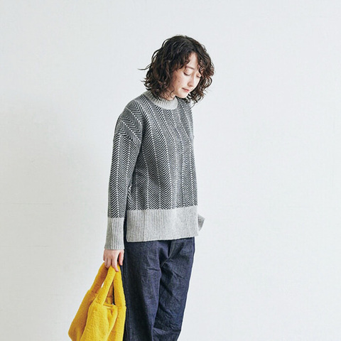 落ち着きのあるヘリンボン柄が上品な一品。毛質の柔らかなタスマニアラムウールで作ったウールニットはチクチクせず癖になるふわふわ感です。