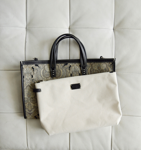 13インチのノートパソコンやiPadが入るサイズの横型ハンドバッグ。女性にとって使い勝手が良い機能性やサイズ感を備えながら、少し振り切った個性とディティールを駆使して情緒的にバッグを仕上げています。