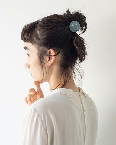 とっても手の込んだヘアゴムなので、髪の毛につけるだけじゃもったいない。アイディア次第で色々な使い方を楽しめます。ふだん使いのバッグの持ち手に付けると、まいにちを華やかで新鮮な気持ちにしてくれるワンポイントに。水色とベージュ、黒と白など違う色を組み合わせて使うと、ぱっと目をひくアクセントにもなります。ゴムが伸びてきたら、新しいゴムをぎゅっと押し込んで付け替えができるので、長めのゴムを通して本や手帳のバンドとしてもどうぞ。貼り合わせた革の周りを軽くやすりがけしてあるので、毛羽立ちにくくなっています。