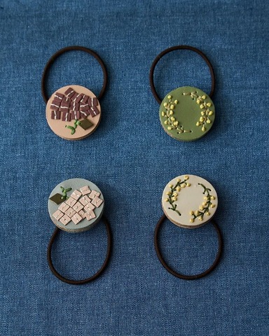 同じ刺繍と革を使ったアイテムは、ヘアゴム、ブローチ、キーリングの3種類。ヘアゴムとブローチなど、アイテム違いで同じ図案を集めればお揃いコーディネートが楽しめます。色や図案の組み合わせでナチュラルかわいくなったり、ニュアンスカラーで大人っぽい雰囲気にも。あなたのお気に入りの組み合わせを見つけてくださいね。