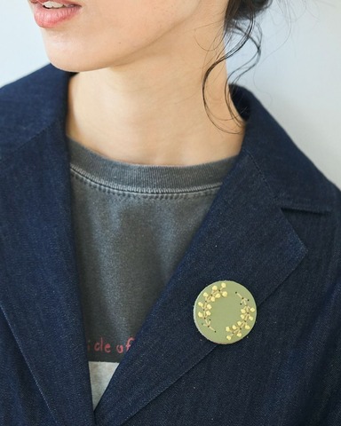 厚みと立体的な刺繍が優しい存在感を出しているので、厚手のコートの襟元や胸元につけても主張してくれるブローチです。黒やグレーなどのダークトーンが多くなりがちな秋冬に、ぱっと鮮やかな彩りを添えてくれます。 無地のセーターや革バッグなどシンプルなアイテムに合わせやすいのはもちろん、小花柄のワンピースの胸元につければ、よりガーリーな気分に。