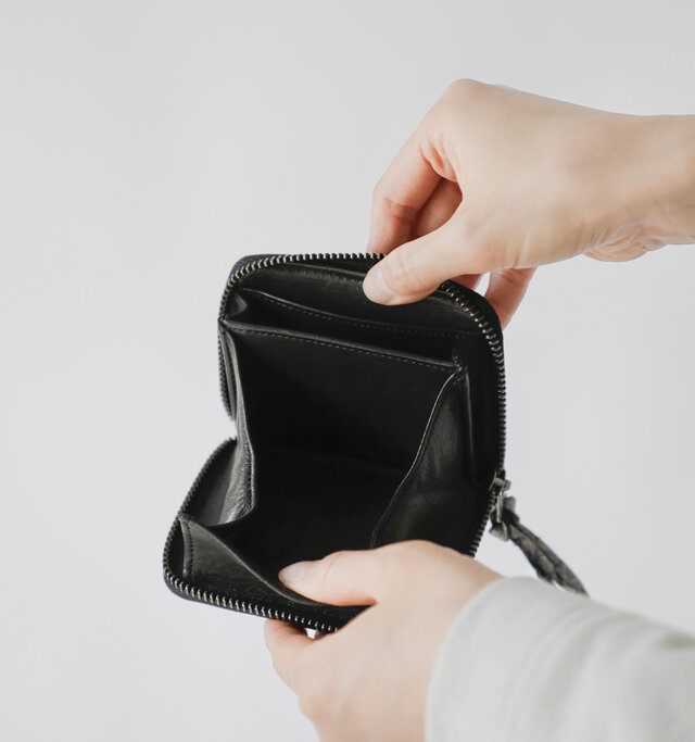 コンパクトに持ち運びしやすいサイズ感のコインウォレット。カードポケットが2つと、コインポケットが1つ付いています。小銭の収納部分は、立体的でこぼれ落ちる心配もなく、しっかりと中身が見やすくなっています。