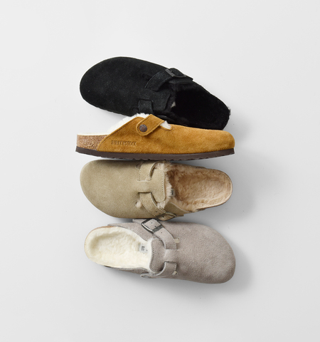 ビルケンシュトックの定番クロッグ、Bostonが超高級スエードレザーで飾られたホカホカのモデルで登場です。天然ラムスキンボアで覆われた中敷きとストラップのライニングが、おしゃれに、暖かく足元を包みます。素足ではもちろん、ソックスを合わせてもこれからの時期にピッタリなアイテム。