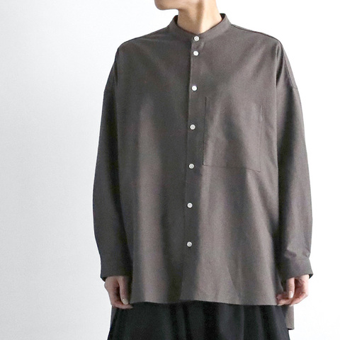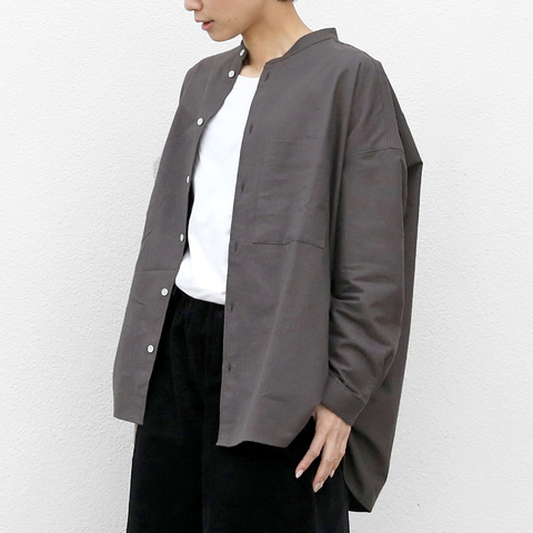 身幅をたっぷりととったオーバーサイズのシャツ。バンドカラーのすっきりとしたデザインです。