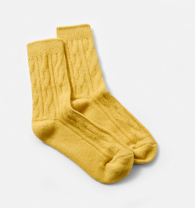 ケーブル柄が季節感のあるナチュラルふんわりとしたクルー丈のソックスです。コーディネートのアクセントとしても重宝します。素材には上質なウールをミックスしており、冷えた足元をやさしく温めてくれる為、外出用としてはもちろんルームソックスとしてもおすすめです。