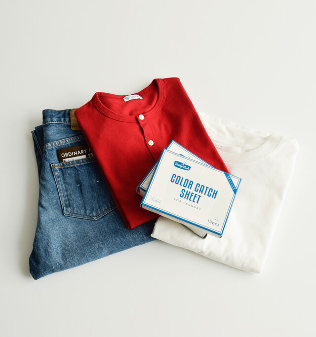 色柄物を洗う時、白い服への色移りが心配。そんな時はこの「カラーキャッチシート」を使えば、一緒にまとめてお洗濯することが出来ます。