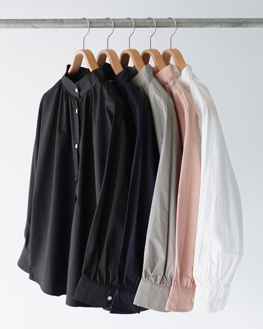 ギャザーがシンプルなシャツに柔らかな立体感をプラス。顔まわりをすっきり見せるスタンドカラーで、甘さを抑えた大人の品を演出。