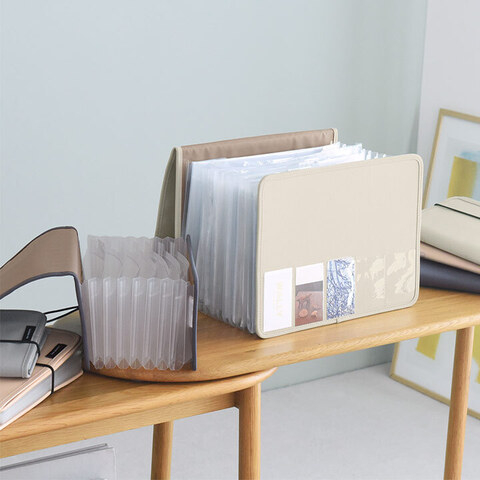 伸び縮みするジャバラ構造なので、いつの間にか溜まっていた大量の書類もすっぽり。広げたまま自立するので、書類を探すのもスムーズ。収納後は閉じて本のように見せ置きしておけます。