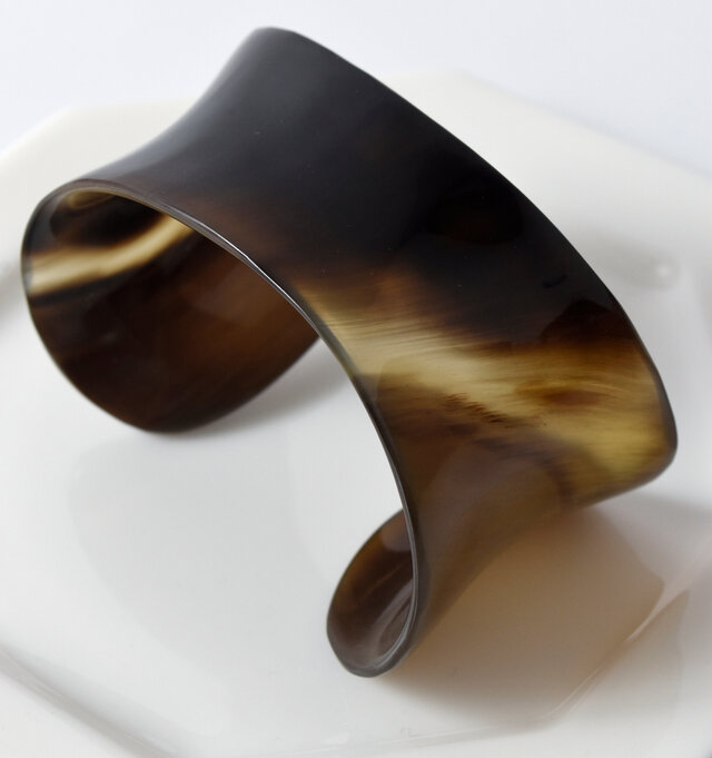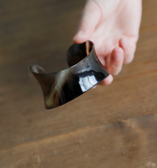 水牛の角の魅力を最大限に生かし、ベトナムの職人がひとつひとつ丁寧に磨き上げ、エレガントなアクセサリーに仕上げています。緩やかな曲線と磨き上げられた表面の艶が美しく、幅広の存在感のあるブレスレットは手元を華やかに彩ります。暗めの色を貴重したブラックホーンを使用しているので、様々なスタイリングに上品に馴染みます。