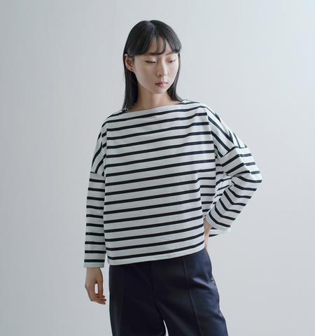 リラックス感と上品さを兼ね備えた大人のカジュアルスタイルを演出するビッグマリンボートネックカットソーです。