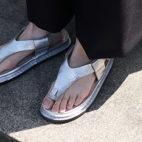 足元には、メタリックな輝きが目を引くシルバーのフラットサンダルをセレクト。シンプルな装いにほどよい華やかさと抜け感を添えてくれるアイテムで、黒のトーンに映えるアクセントとしても◎。