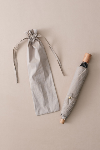 傘と同じ生地を使用した巾着袋が付きます。出先でもさっと仕舞えるように、袋は余裕を持たせたゆったりサイズに設計しました。