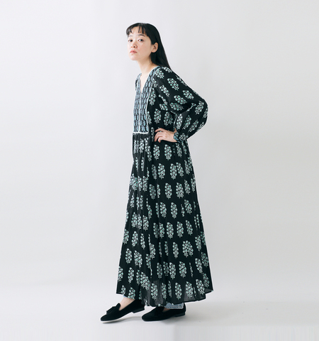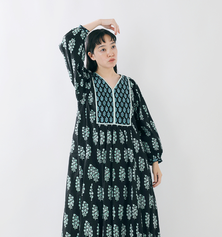 インド中央部の先住民族が描いたトライバルアート“ゴンド”にインスパイアされた色柄が視線を集めるエスニックドレス。大胆なモチーフ使いの3柄をミックスし、胸元をカラーパイピングで切り替えたデザインは「ヌキテパ」らしい色彩センスが際立つ1枚。