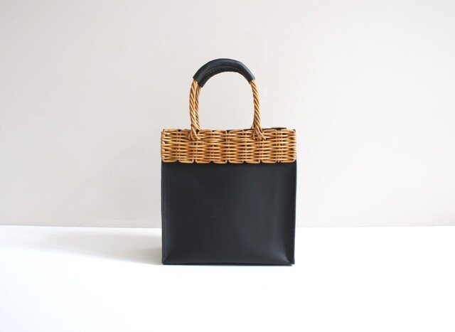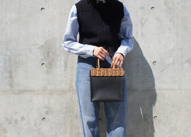 1点1点、職人の手で丁寧に編まれたかごバッグ。高い強度をもつアラログ(ラタンの一種)は、表面にツヤ感があり、独特の雰囲気を持ちます。多様なコーディネートにマッチするよう、ブラックのレザーを合わせました。