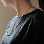 風合いのある真鍮ビーズは、ひとつひとつ手仕事でつくられています。カラーは「真鍮」と、真鍮にシルバーメッキをほどこした「シルバー」の2種類と「60㎝の長さのS」と「120㎝の長さのL」の計4種類。ブラックやネイビーなど落ち着いた装いによく映え、Tシャツやリネンワンピースにも似合います。これから増えるオケージョンスタイルにも、主張しすぎない、ほどよい華やかさを添えてくれます。