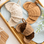 代金(700円)のうち40%は編み手のお母さんたちへ、残りは原材料費や活動資金として使われています。アクリル100%の毛糸で編まれており、洗剤を使わず、水だけで汚れが落ちる環境にもやさしい道具。ころんとした形と、ひとつひとつ異なる表情は、使わない時間もキッチンに置いておきたくなるかわいさです。