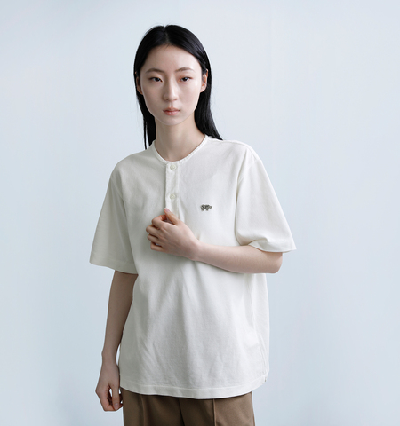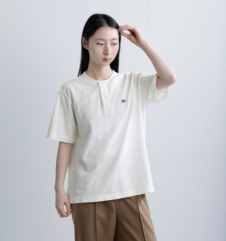 抜け感のあるカジュアルスタイルを叶えてくれるヘンリーネック。首元をすっきり見せ、メンズライクな雰囲気に。さりげないロゴの刺繍がアクセントになり、品のある装いを演出してくれます。