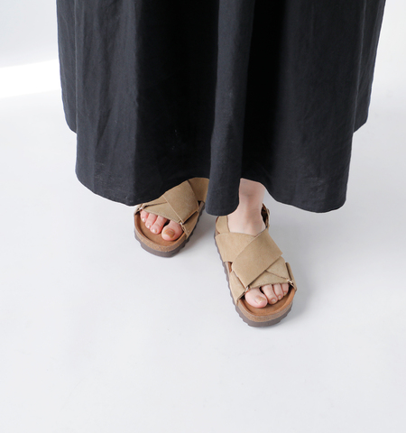 幅を広めにとったレザーをクロスにした、ボリュームのあるアッパーデザインが可愛いサンダル。