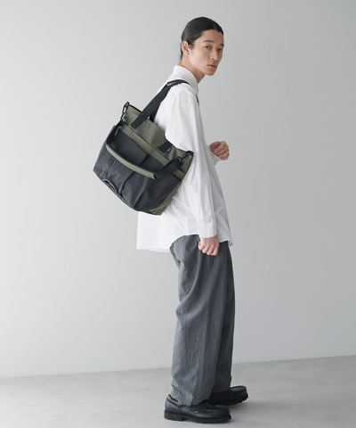 ・本体は600d(デニール)のリサイクルポリエステル「RENU®」を使用した素材になります。一般的なリサイクルポリエステルでは使用済みのペットボトルを原料とし、溶かして再度糸にする手法ですが、「RENU®」は使い終わった古着や工場での生産時に出た残反生地を原料としています。分解・再重合などといった工程を経ることで、石油由来のポリエステルと比較してもクオリティが劣らないポリエステルを生産することができます。裏側はウレタンコーティング加工を施しています。