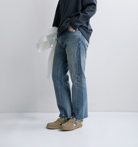 薄すぎず厚すぎない、程よい厚さの13.5oz。程よいハリ感がありますが、穿き込むうちに生地が馴染み、しっくりとした生地感に育ちます。各所に施された汚れや傷もさりげない個性を演出。ダメージ加工も素晴らしく、まるで長年着込んできたような雰囲気が魅力です。