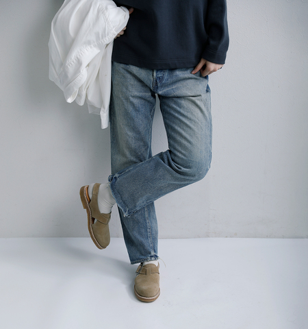 ダメージ加工も素晴らしく、まるで長年着込んできたような雰囲気あるデニム。足首が見えるアンクル丈で抜け感があり、全体のバランスが気になったとき簡単に取り入れられる着こなしとしておすすめです。