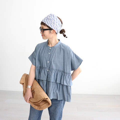 SOIL|ストライプ・バンドカラーギャザーシャツ