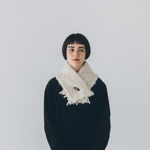 羊のカールした毛をイメージした、スラブ感のあるウール糸でループ状に編み立てたミニマフラーです。