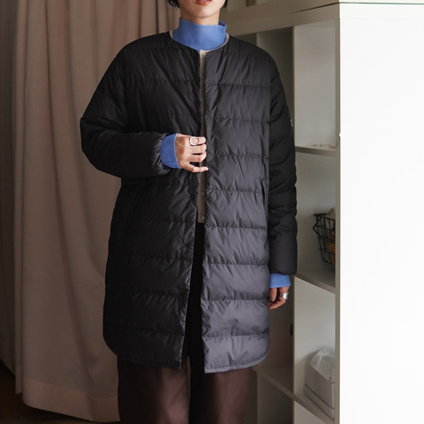 ノーカラーのロングダウンで、クリーンかつ都会的な印象に。インナーのブルーが差し色として奥行きを生み、ブラウンパンツで温もりをプラス。