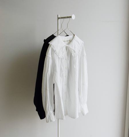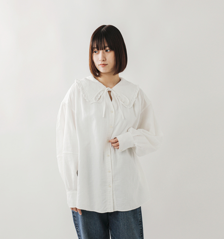 爽やかなコットンガーゼ素材で作ったギャザーブラウス。胸元と袖山、そして背中とたっぷりと入ったギャザー、そして大きなカラーがスウィートなムードに。肘の切り替えや、襟に挟み込まれた小さなフリル、V開きにした胸元などディテールにまでこだわりました。共布の紐を垂らしたり結んだりすることで、様々な表情が楽しめます。羽織としても活躍してくれるオーバーサイズです。
