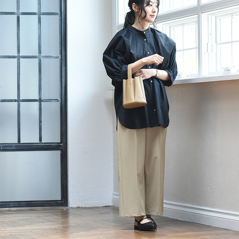 光を通しにくい素材を採用しているので、淡色でもインナーが透けにくく安心。しっかりとした素材感でありながらも軽やかな着心地を叶えています。