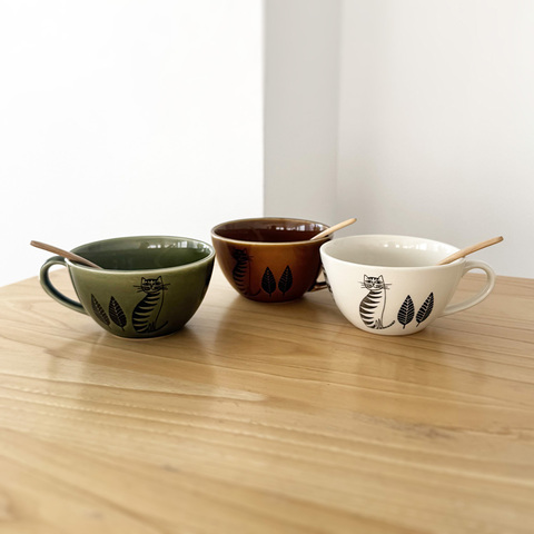 食卓に合うナチュラルで温かみのある色、手になじむ形、そしてノスタルジックな雰囲気で描かれたネコが特徴です。長くご愛用いただいている方が多い、ヘミングスの定番アイテムです。