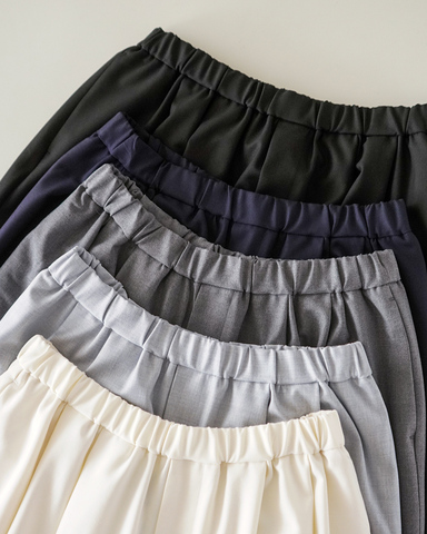 前後に施したギャザーとタックが程よい立体感を生み出し、身体のラインを拾いにくいのも嬉しいポイントです。ウエスト部分はゴム仕様にドローストリングを備え、快適さとフィット感を両立。