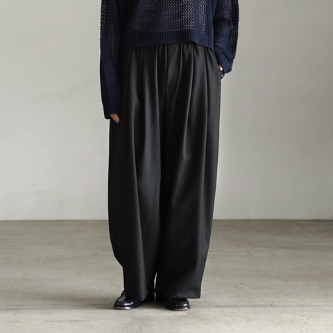 ふんわりと広がるフォルムを描きながらも、裾に向かってすっきりと収まるテーパードラインが魅力のワイドタックパンツ。