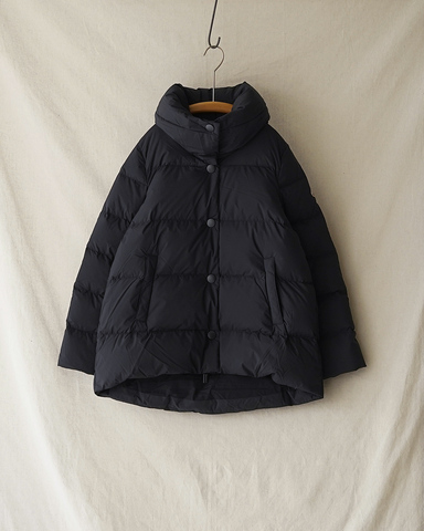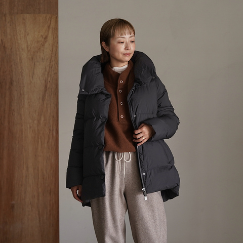 冬の冷たい風を優雅に受け止める、上質で洗練されたミドルレングスのダウンアウター。ふっくらとしたボリューム感のある襟元は、一番上までボタンを閉じることで首元を立体的に包み込み、マフラー代わりにもなるデザインです。