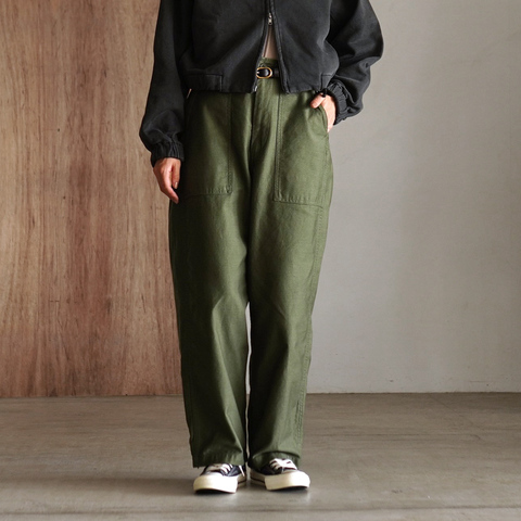素材には通年で穿ける程よい厚みのバックサテンを使用。メタリックなサテンとは異なるマットな光沢が上品で落ち着いた雰囲気を演出します。ヴィンテージ感のある生地で、着用と洗濯を繰り返すほどに、さらに風合いが増していきます。