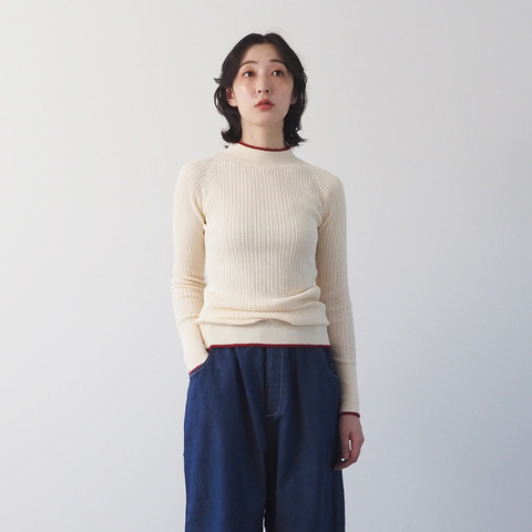 首元や袖口、裾にあしらわれた配色ラインが、シンプルな中にさりげないアクセントをプラス。一枚で着ても、インナーとして重ねても、配色の効果でスタイリングが引き締まり、どこか特別な雰囲気を演出します。